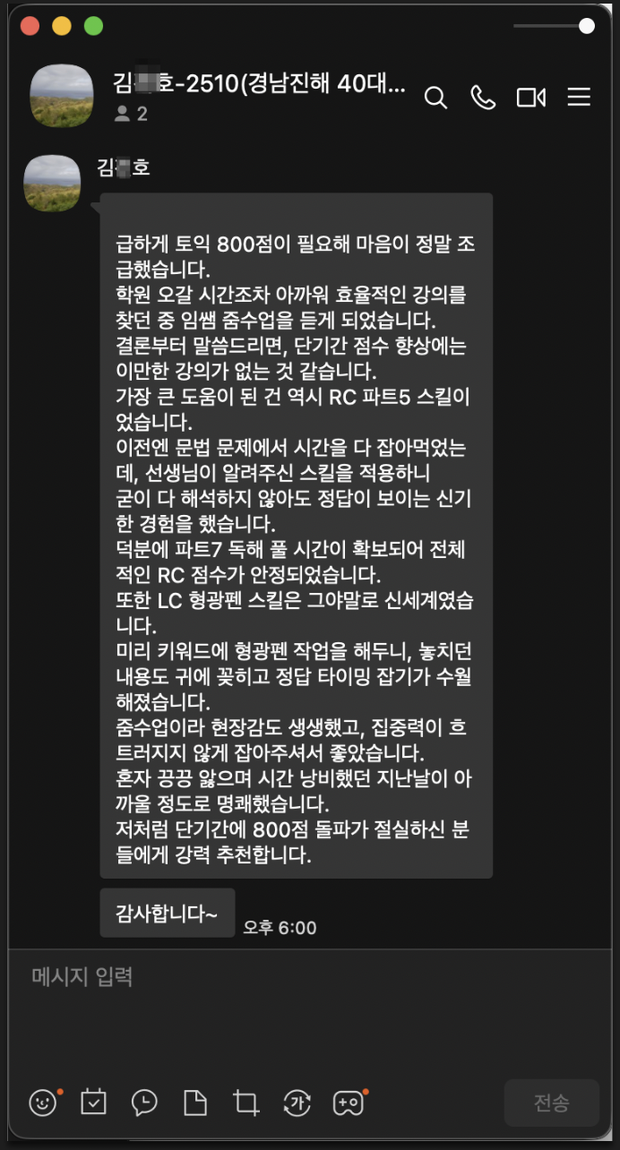 | 40대 후반 직장인의 2주 수강 후 680점 → 760점 후기 (0) | 2025.07.22 |