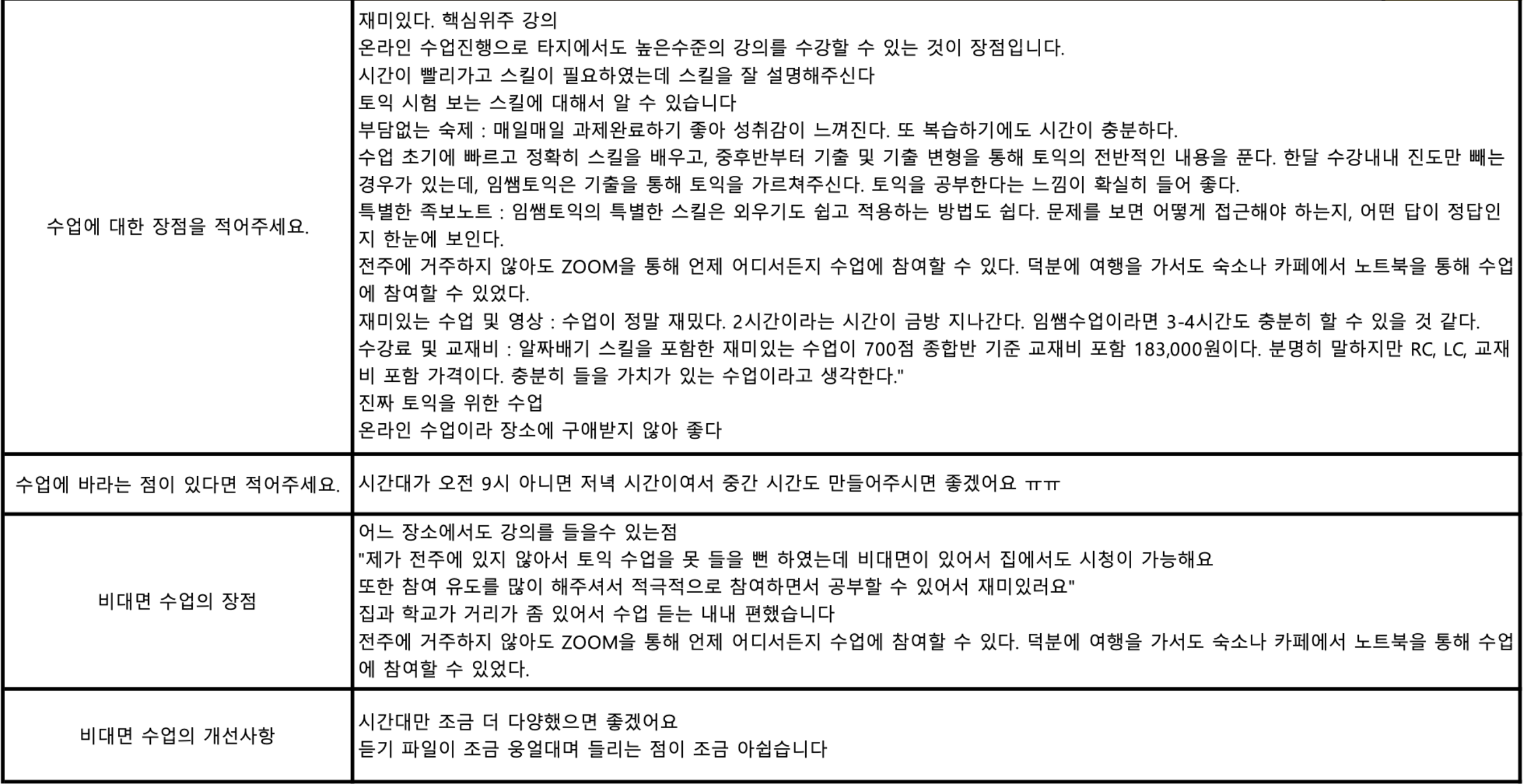03. 임쌤토익은 실시간 Zoom 라이브 수업을 진행해서, 추운날 굳이 강의실로 찾아오지 않고 집에서, 카페에서, 도서관에서 수업을 들을수 있습니다. 또한 매일 수업을 녹화한 고화질 영상을 제공하고, 수강후에도 2개월간 제공합니다.